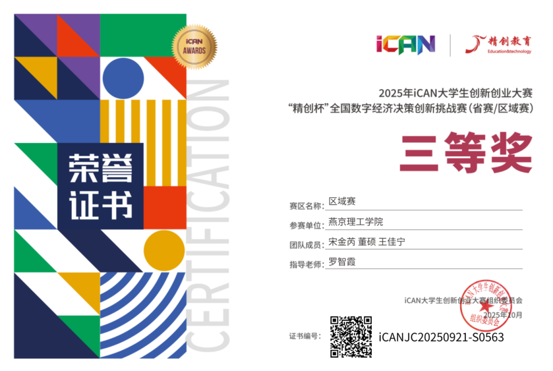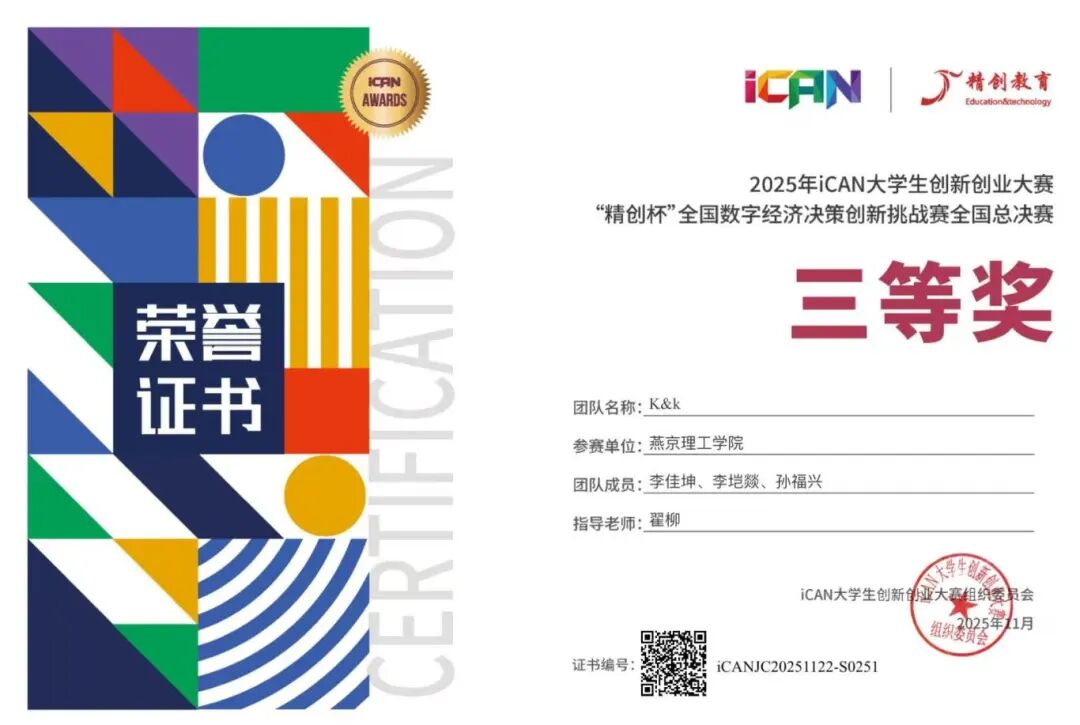 (大赛展示) 近日,2025年iCAN大学生创新创业大赛“精创杯”全国数字经济决策创新挑战赛圆满落幕!本次大赛由iCAN大学生创新创业大赛组织委员会主办,绵阳师范学院承办,浙江精创教育科技有限公司协办。大赛吸引了500余所学校高校,2万余支队伍参赛,同台竞技,竞争异常激烈。国际商学院数字经济专业两支参赛团队凭借扎实的专业功底与高效的团队协作分别斩获全国总决赛三等奖与区域赛三等奖。 全国总决赛获奖团队 (获奖信息) 团队成员:李佳坤、李垲燚、孙福兴 指导老师:翟柳 获奖等级:全国总决赛三等奖 区域赛获奖团队 (获奖信息) 团队成员:宋金芮、董硕、王佳宁 指导老师:罗智霞 获奖等级:区域赛(省赛)三等奖 此次获奖,是对学子们辛勤付出的肯定,是对指导教师深耕教学的认可,更是我校“以赛促学、以赛促创”教育理念的生动实践。一直以来,学校始终致力于搭建高水平双创平台,通过赛事赋能,锤炼学生的专业能力与创新思维。未来,期待更多燕理学子以获奖团队为榜样,敢于创新、勇于实践,在各类赛场书写青春华章,为数字经济发展贡献燕理力量! (合影留念)