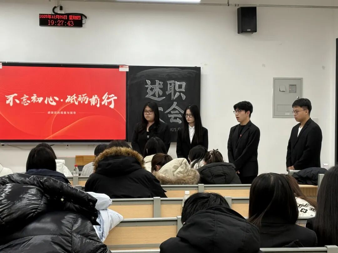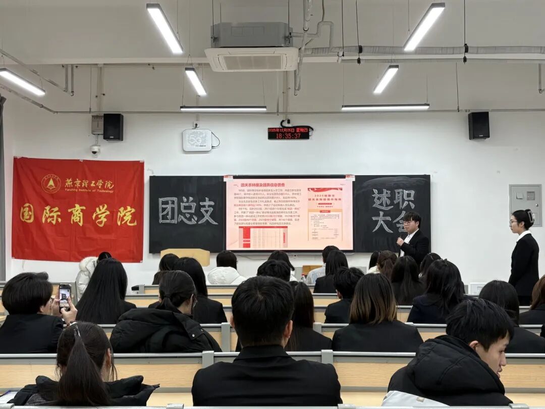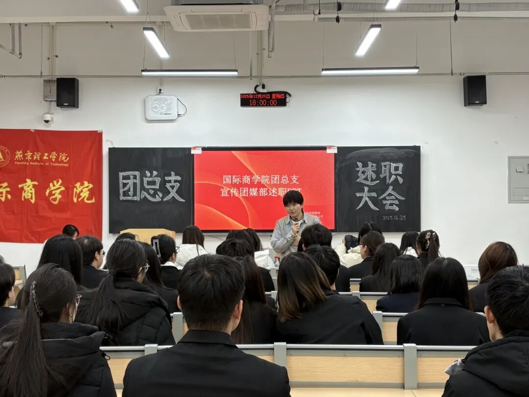 为总结过往工作经验,明晰未来发展方向,凝聚团队奋进力量,燕京理工学院国际商学院团总支述职大会于12月25日在K2-101教室进行。本次述职会由团总支指导老师戴红妹及大二大三成员全体参与,回顾并肩前行的点滴,共赴新程谋发展。 (全体人员合照) 会议伊始,戴红妹老师明确了述职要求。随后主持人宣布会议正式开始。团总支各部门部长依次上台发言,围绕日常工作开展、组织建设情况以及特色创新项目等方面进行了全面梳理。汇报不仅展示了2025年取得的各项进展,也对工作中存在的不足进行了深刻的反思。在此基础上,各部门还提出了下一阶段的具体规划与改进思路,力求优化工作方法,提升工作实效,使团总支更好地服务于同学成长与学院文化建设。 (老师正在发言) (部长在述职) 随后,戴红妹老师对各部门工作展开细致点评,在肯定各部门付出与成果的基础上,针对汇报内容逐一提问,各部门部长现场作答后,戴老师又结合回答对工作进一步作出指导。大会尾声,戴红妹老师与大三学生干部对本次述职及各部门工作进行了总结指导,并围绕下一步工作的开展方向提出了更为具体的希望与建议,鼓励各部门持续优化工作方式,为推动学生组织工作再上新台阶凝聚力量。 (部长在述职) 此次述职大会的顺利召开,既是对过往工作的全面复盘,也是对未来征程的全新擘画。相信在全体成员的共同努力下,国际商学院团总支定能凝聚更强合力,在新的征程上再创佳绩、再谱华章!