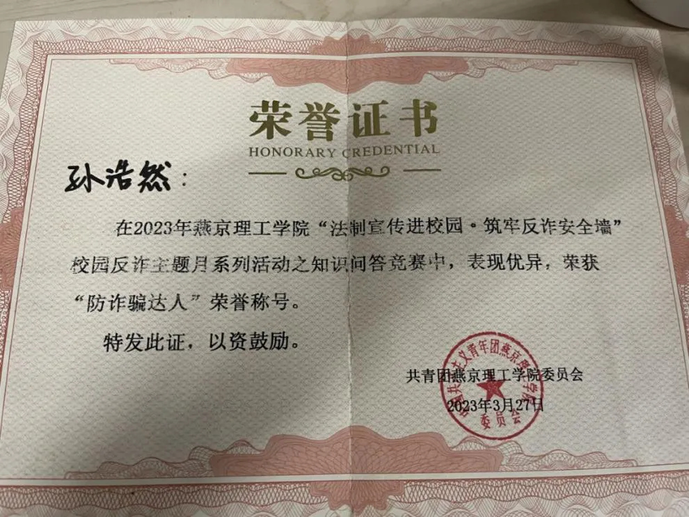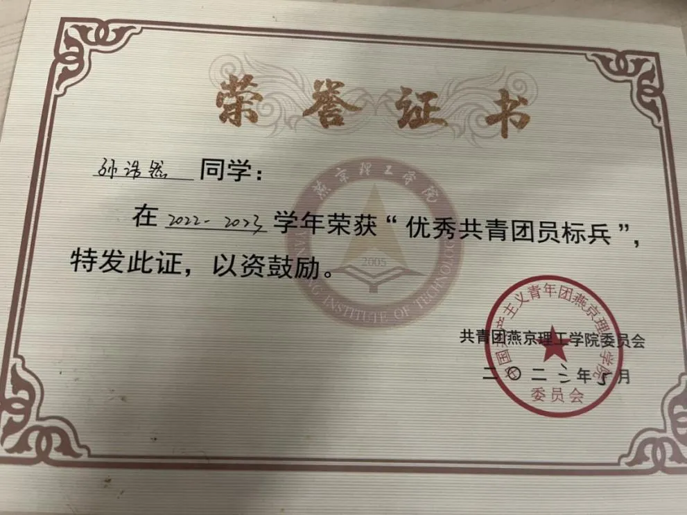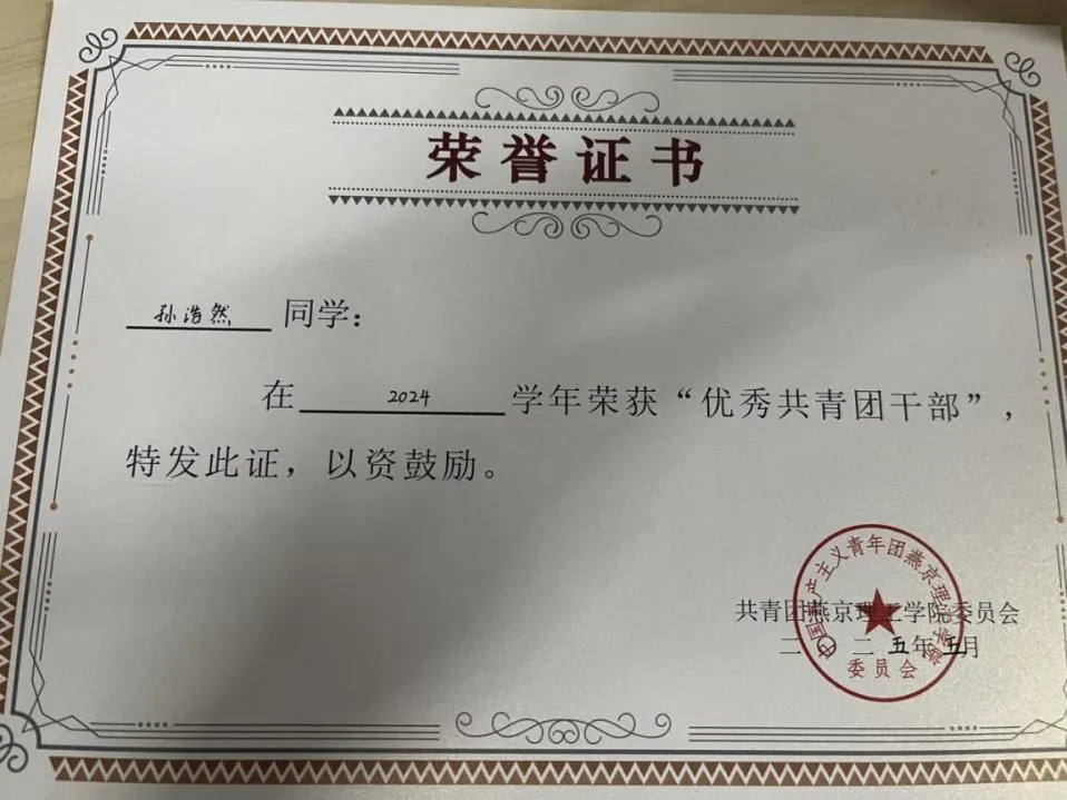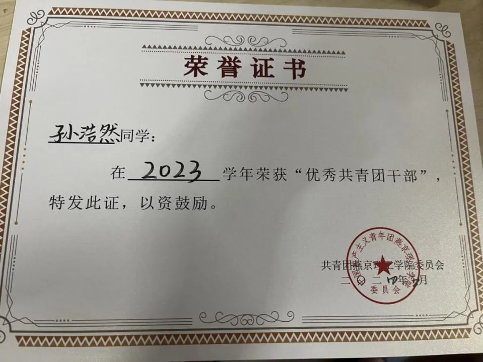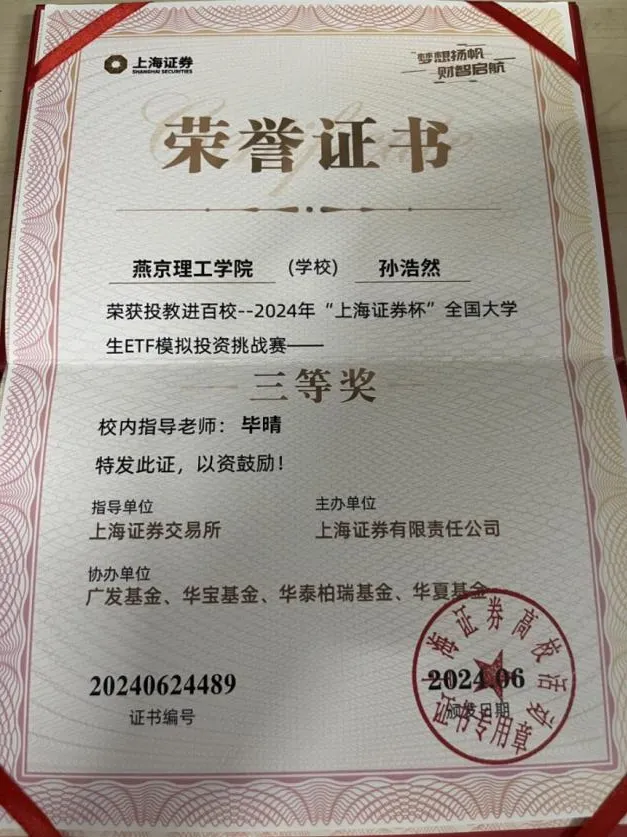 孙浩然 性别:男 专业班级:数管2204班 主修专业:大数据管理与应用 辅修专业:法学    在校期间表现:担任数管2204班团支书,“上海证券杯”全国大学生ETF模拟投资挑战赛三等奖,“全国大学生乡村振兴知识科普暨青年乡村振兴短视频大赛”知识竞赛赛道一等奖,“新阳光白血病线上授课”国际商学院“优秀志愿者”,校园反诈竞赛中获“防诈骗达人”荣誉称号,三次校级三等奖学金,两次院级优秀学生干部,两次校级优秀共青团干部,校级优秀共青团员标兵,校级军训优秀学员,考取全媒体运营师技能证书,通过英语四级,通过教师资格证考试,参加校运动会乒乓球比赛,参加班级风采大赛素拓赛道,参加“跟着总书记打卡百年青运史”主题活动,参加“大学生就业服务平台大赛”。
